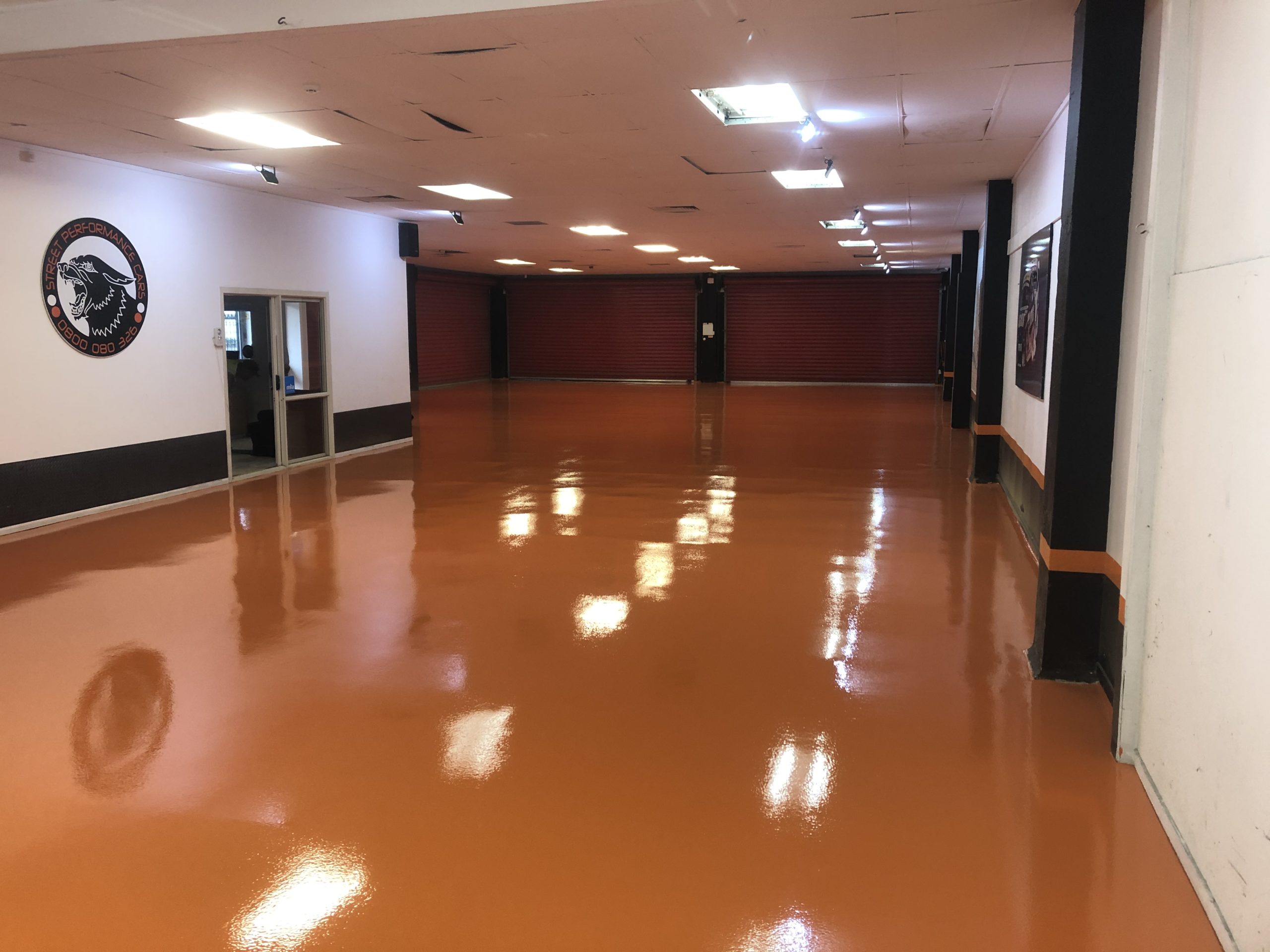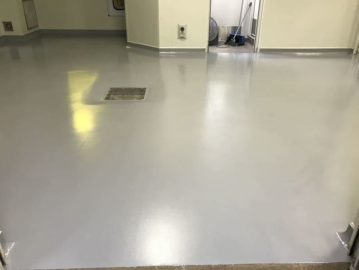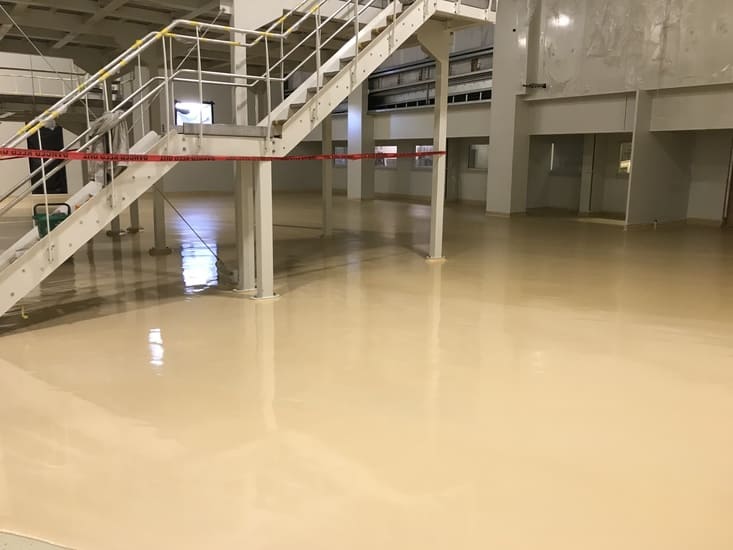 This epoxy/polyurethane floor was installed in a new packing area and finished with a fine texture using ceramic spheres to provide moderate slip resistance and ease of cleaning.
